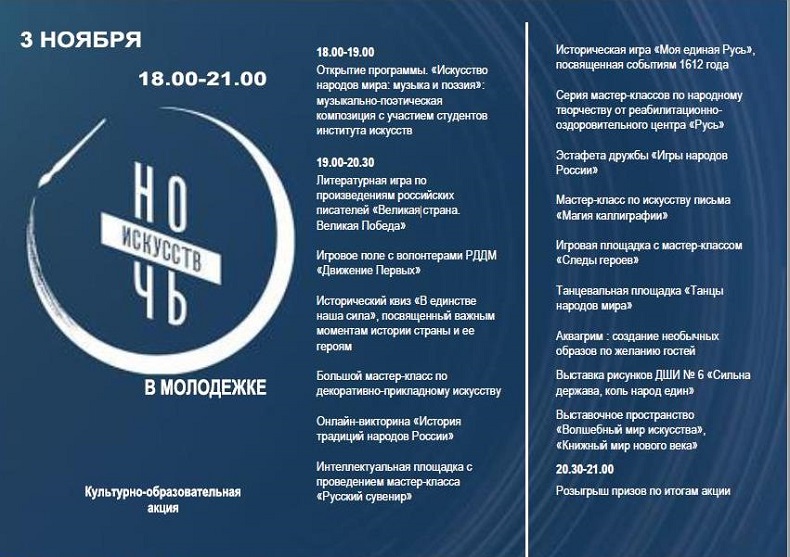 Друзья! 3 ноября в 18.00 состоится традиционная Всероссийская культурно-образовательная акция "Ночь искусств". В этом году ее мероприятия будут приурочены ко Дню народного единства. Мы подготовили информационные онлайн-материалы, посвященные этому событию, которые доступны на нашем сайте по ссылкам ниже.